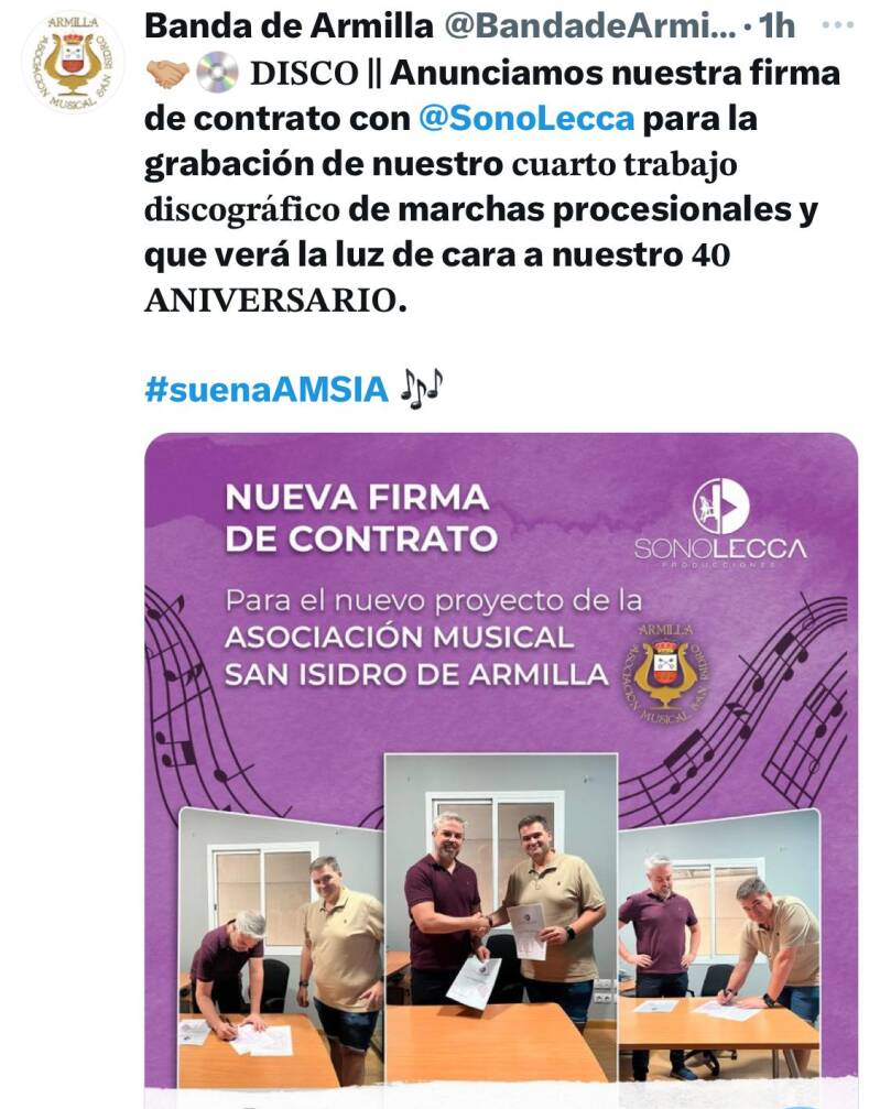 Es un placer anunciaros a todos nuestros lectores y Amigos de la Música Cofrade que recientemente la granadina Banda de Música de la Asociación Musical de San Isidro de Armilla a subido a sus redes sociales la noticia de la firma del contrato con la Discográfica Sonolecca para la grabación de su 4º trabajo Discográfico que verá la luz coincidiendo con los actos de su 40º Aniversario . Os seguiremos informando más adelante de la fecha de su presentación y de las marchas que compondrán el repertorio de este Cd.